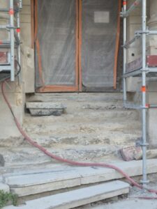 Les pierres de l’escalier de la façade du côté est (à droite) ont été entièrement déposées. Les